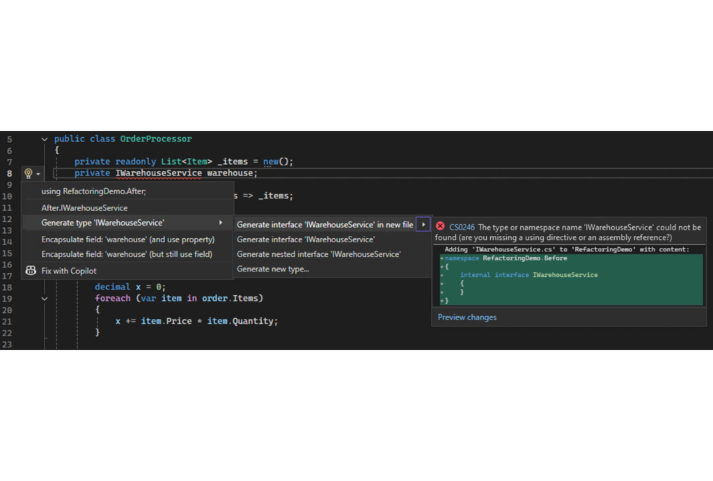 U ovom tekstu delim devet kratkih, praktičnih refactoring rutina koje zahtevaju 15 minuta ili manje, a dugoročno prave ogromnu razliku. Svaku ilustrujem na jednom malom C# projektu za obradu porudžbina (RefactoringDemo TODO: upload and add link to GH) — direktorijum Before sadrži kod pre refaktorisanja, a After primenjuje sve obrasce o kojima govorimo.