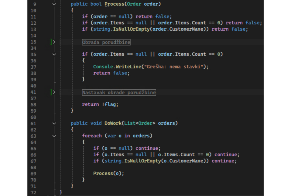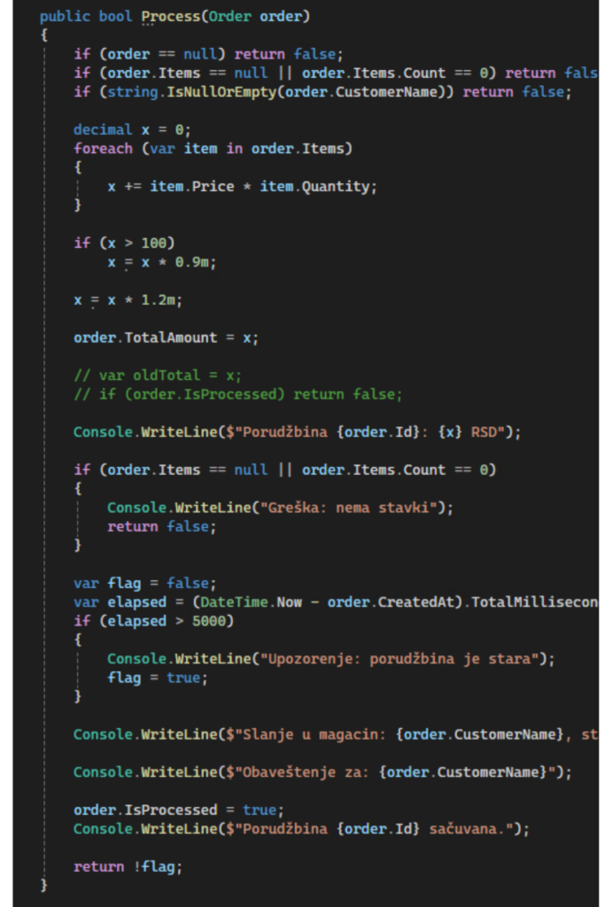 Pogledaj kako izgleda jedan monolitan metod u našem primeru — validacija, kalkulacija, slanje u magacin, obaveštenje i čuvanje, sve u jednom: