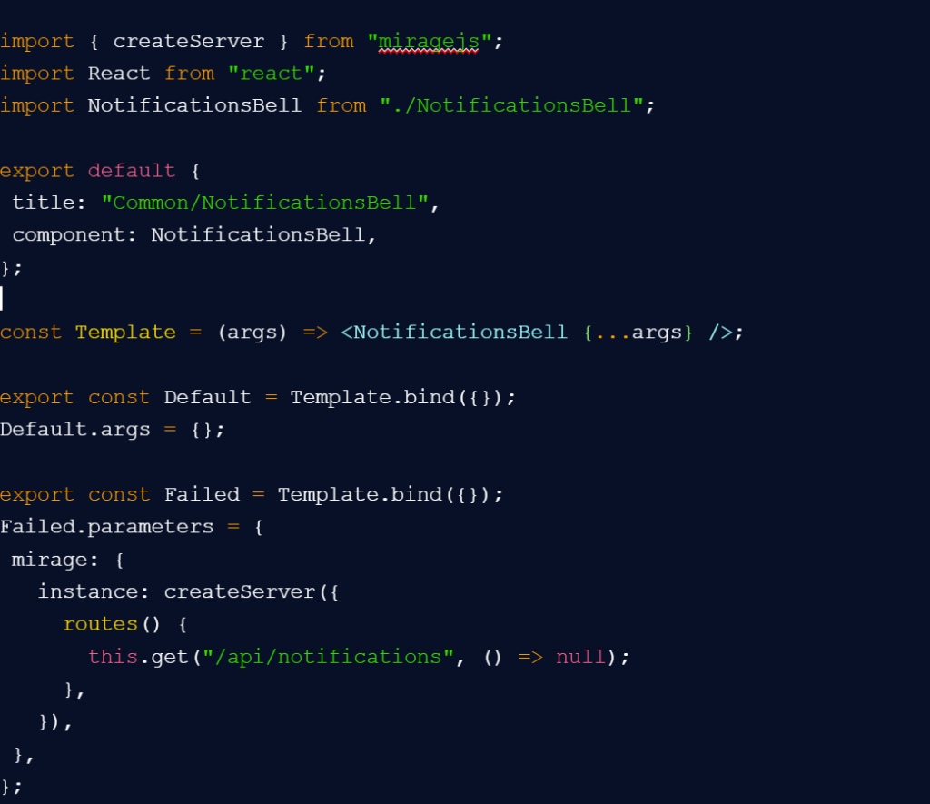 Gde naš resurs “notifikaciju” definišemo kao MirageJS Model i zatim našu unutar memorijsku (lažnu i privremenu) bazu podataka popunimo sa seeds funkcijom. Ovo može da se odvede i korak dalje kreiranjem seed vrednosti putem factory-ja kada želimo da stvorimo više vrednosti (stotine ili hiljade) programski. Ovaj kod se drži u server.js fajlu unutar src foldera (dokumentacija to predlaže), i stupa u dejstvo jednostavnim dodavanjem u App.js: