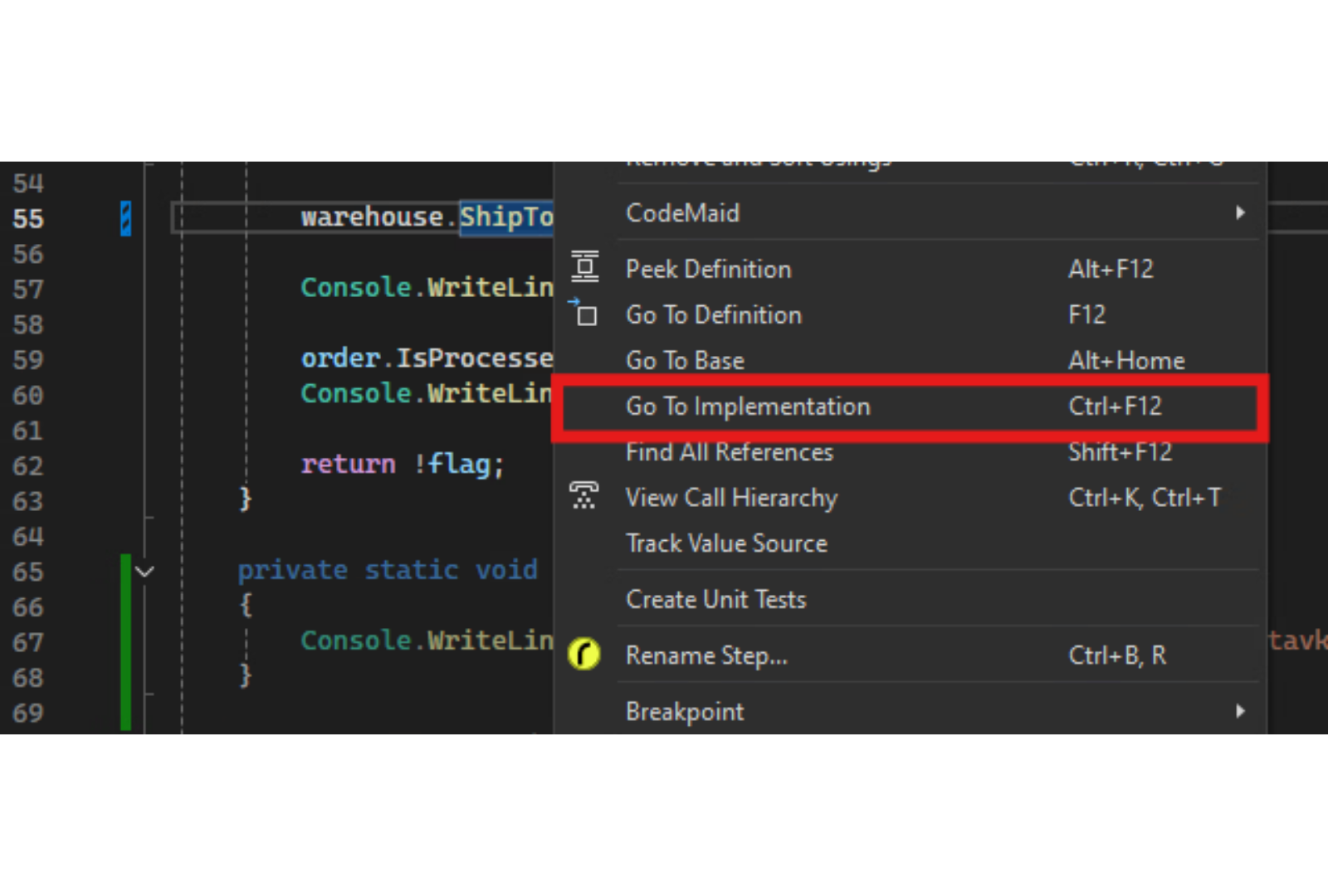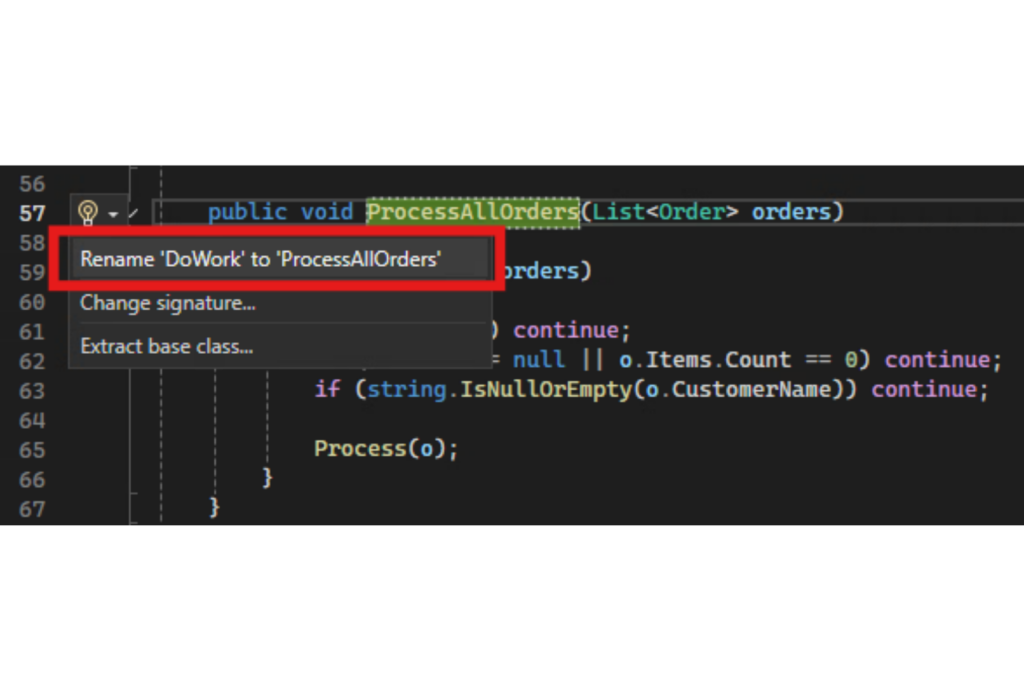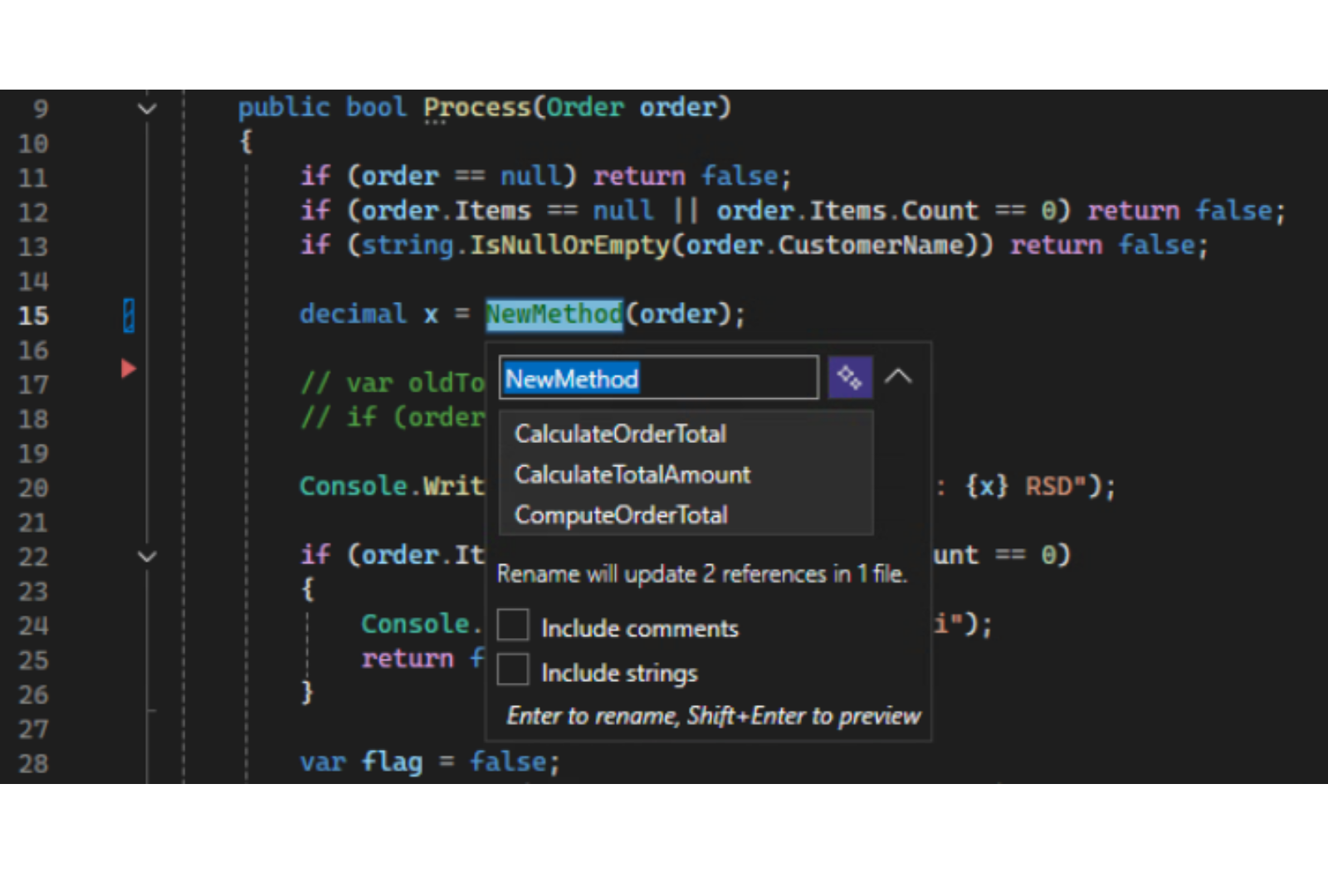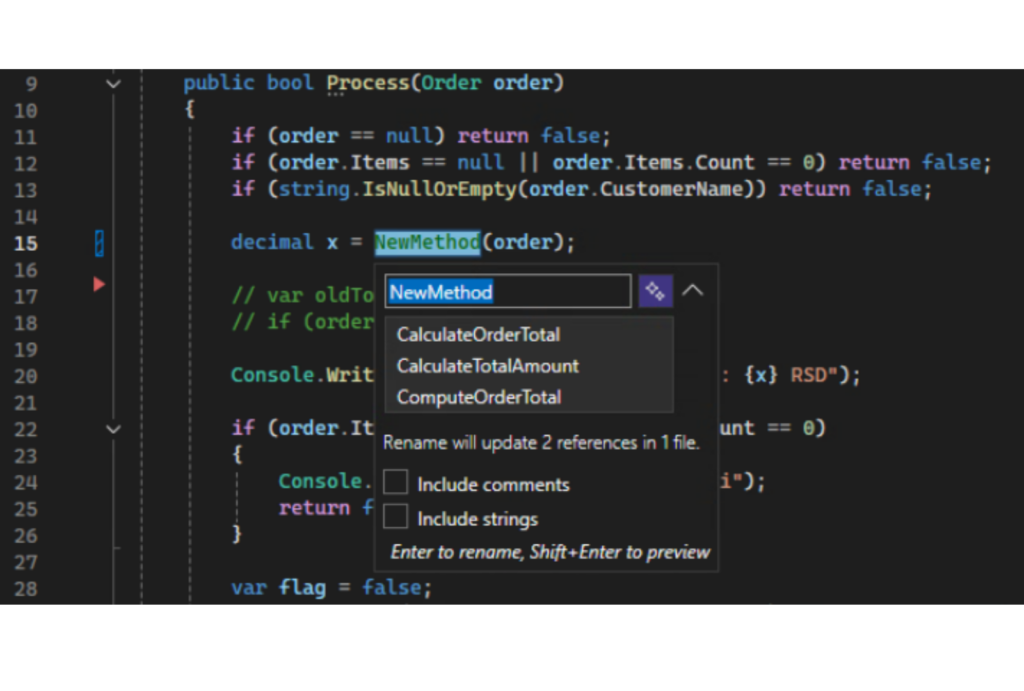 Visual Studio takođe nudi i direktno Rename komandu u kontekstnom meniju ili preko prečice, obično „F2“ ili „Ctrl+R, Ctrl+R“, ali ovo može da varira, pa proverite pre upotrebe.