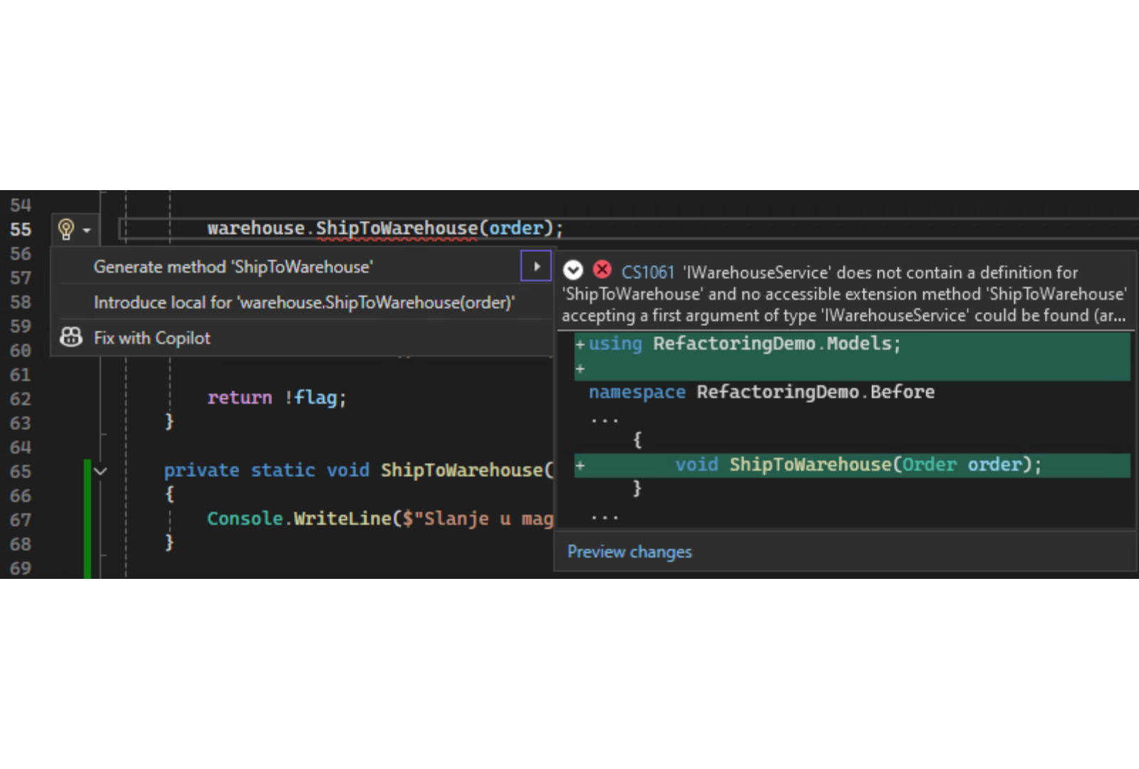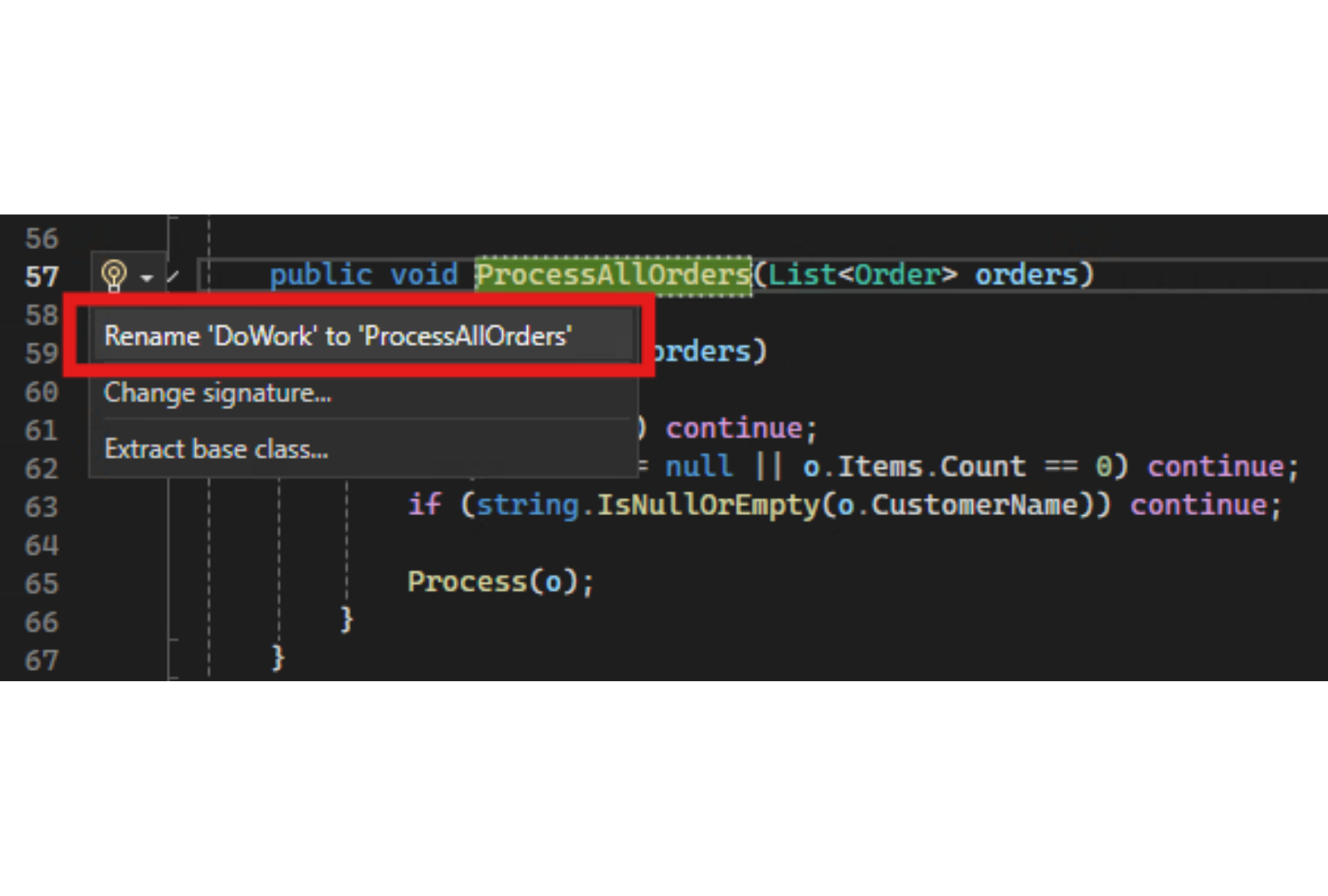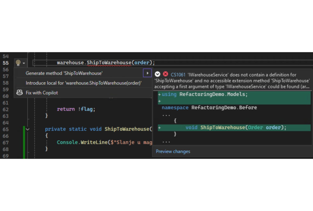 Ima više načina da pokrenemo ovaj refactoring u Visual Studio, ali jedan od najlakših je da samo promenimo naziv: