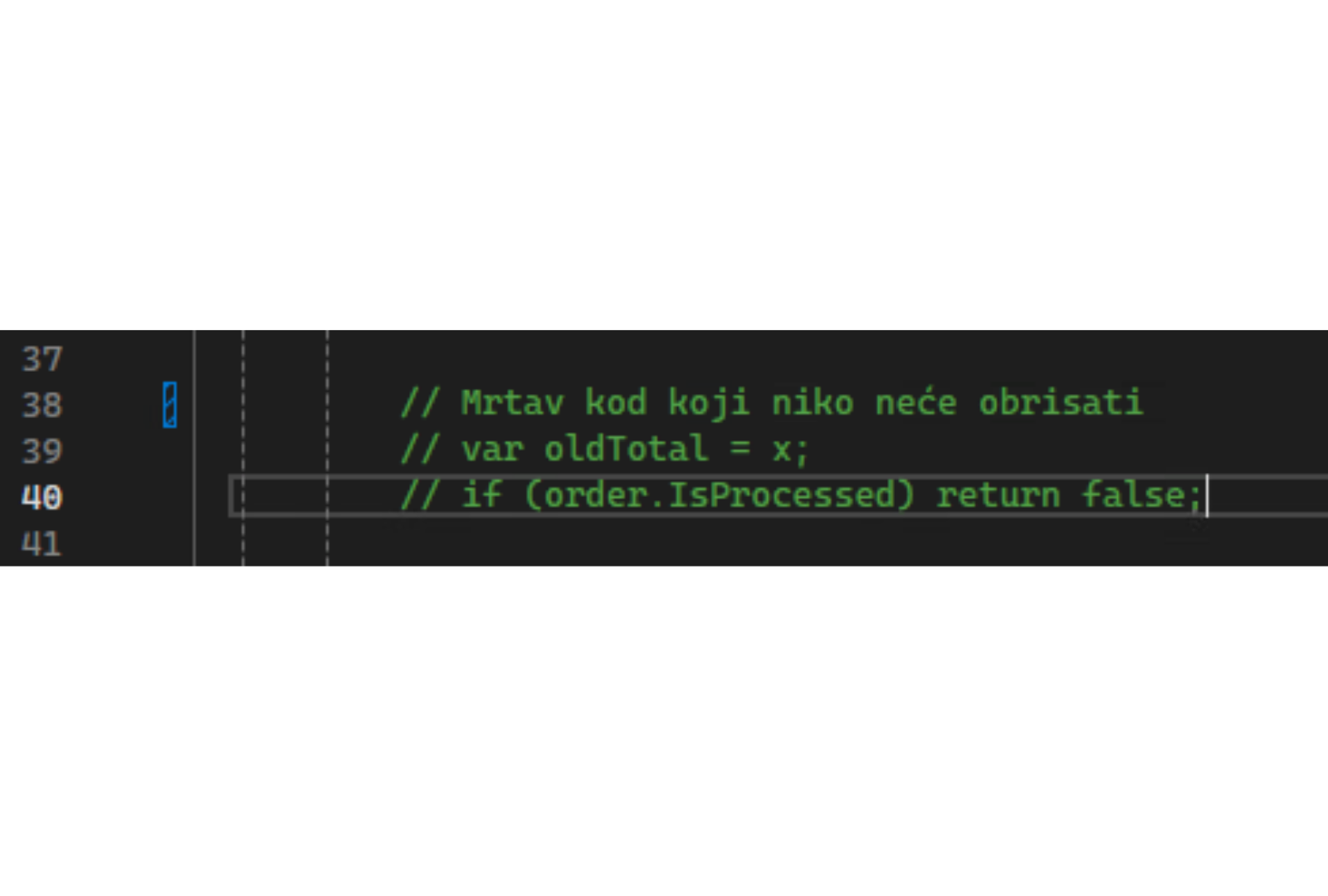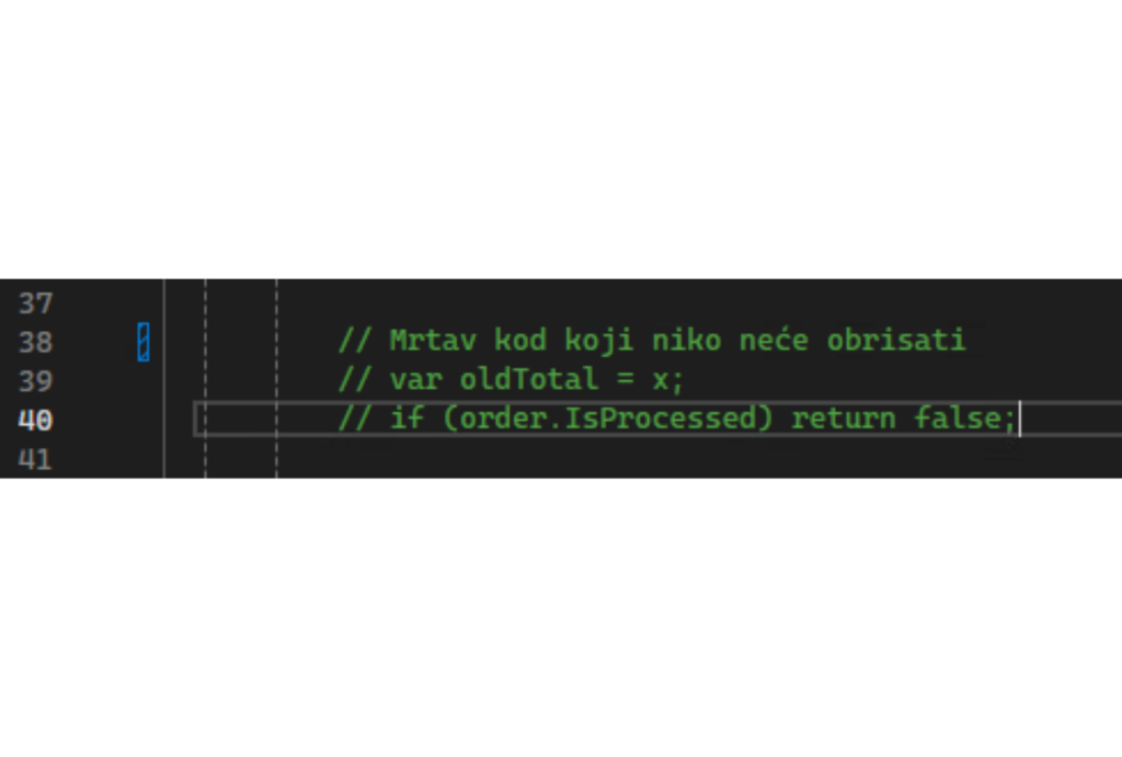 U našem primeru nailazimo na klasične „boy scout" probleme — zakomentarisan mrtav kod: