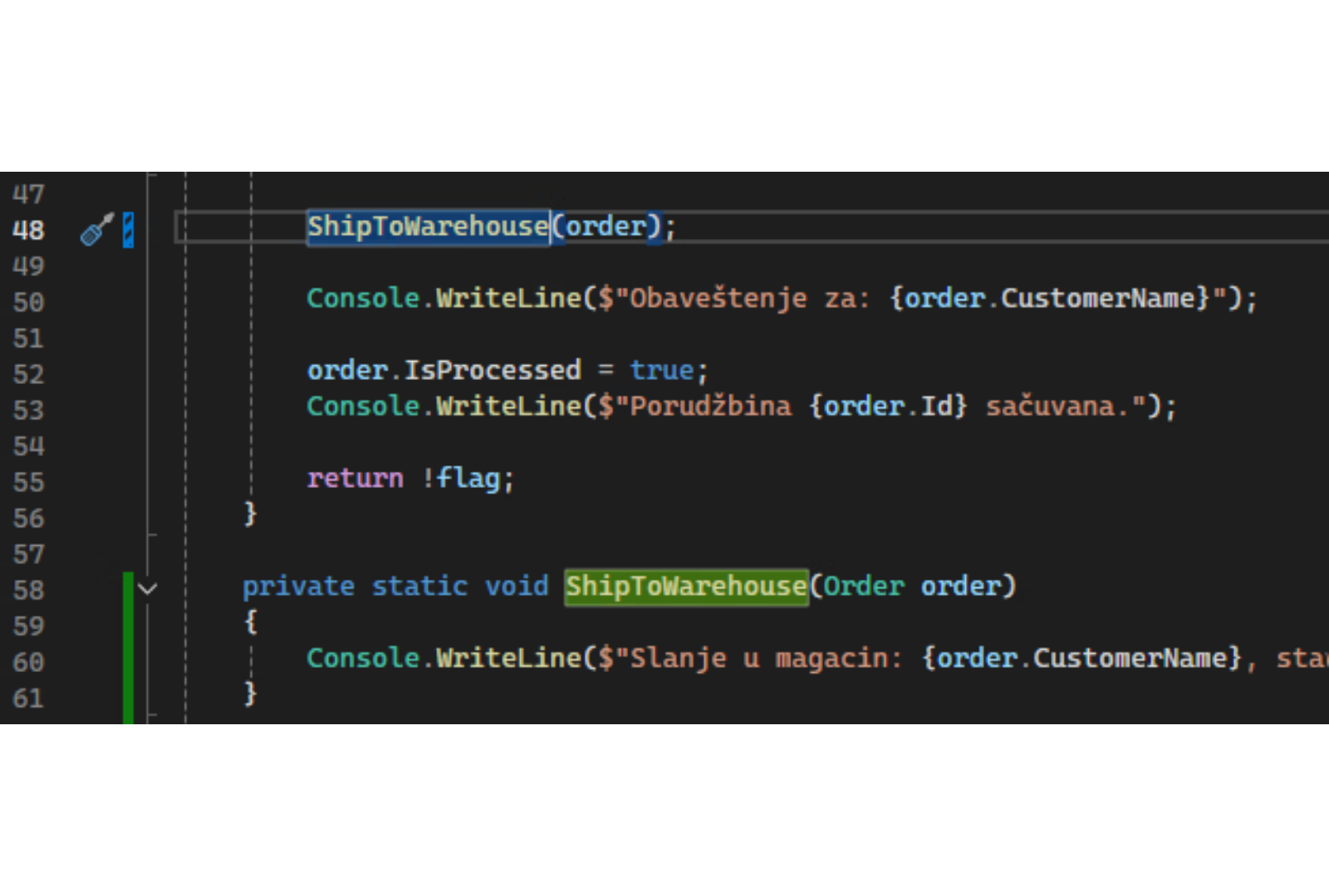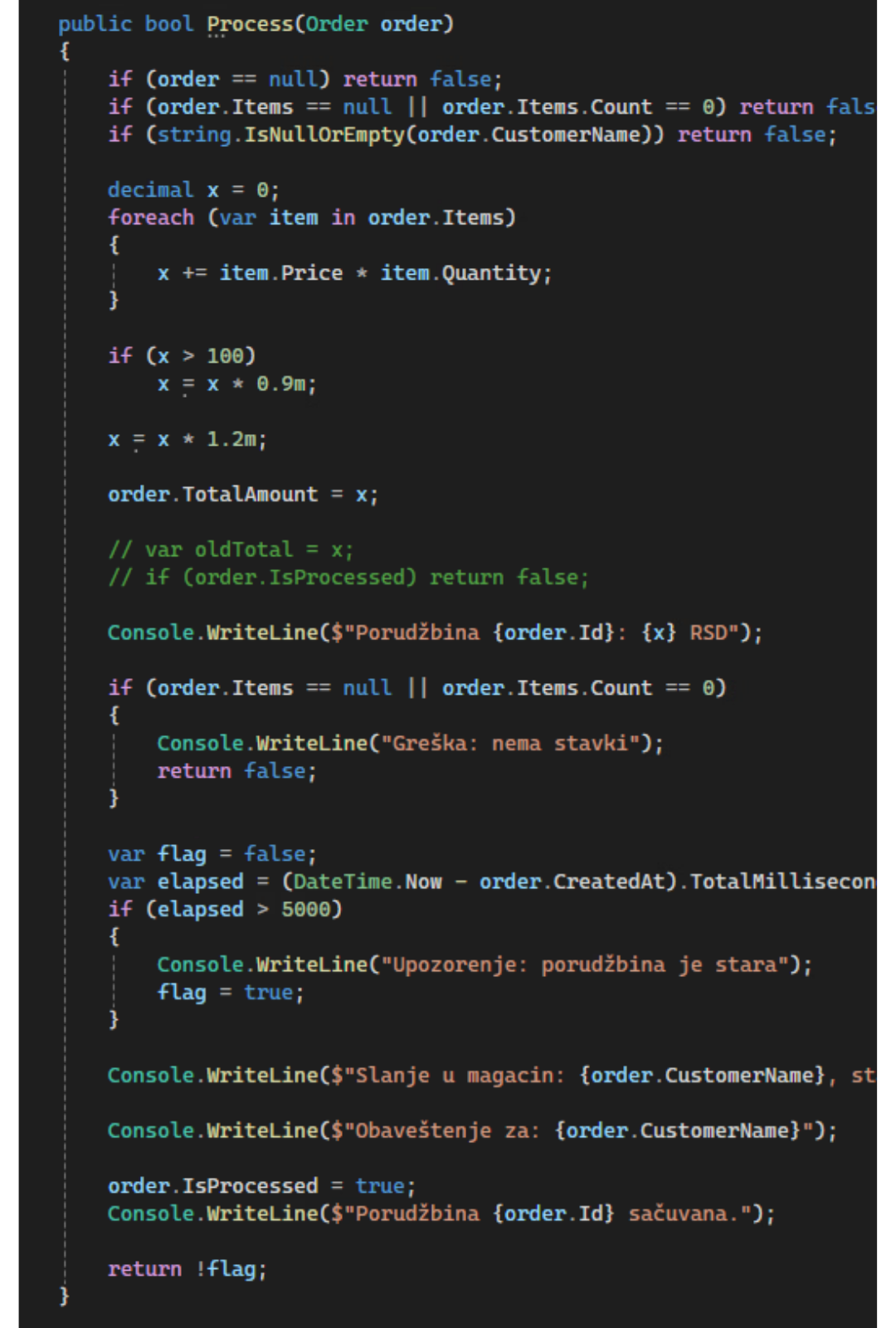 Pogledaj kako izgleda jedan monolitan metod u našem primeru — validacija, kalkulacija, slanje u magacin, obaveštenje i čuvanje, sve u jednom: