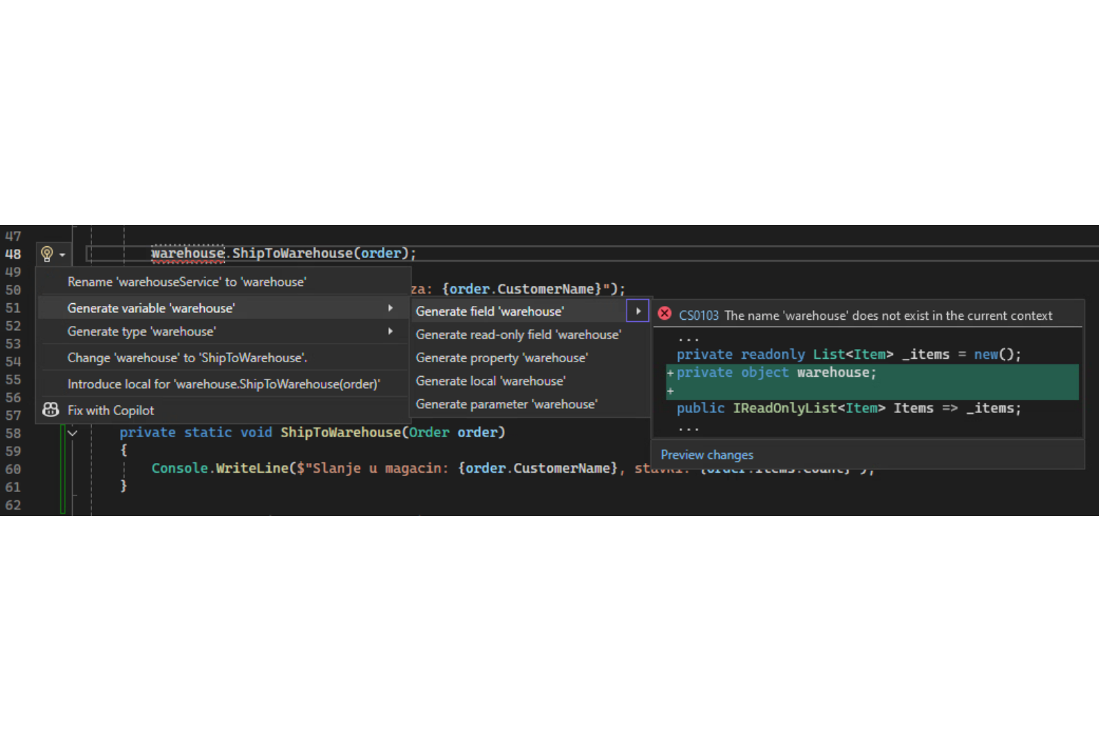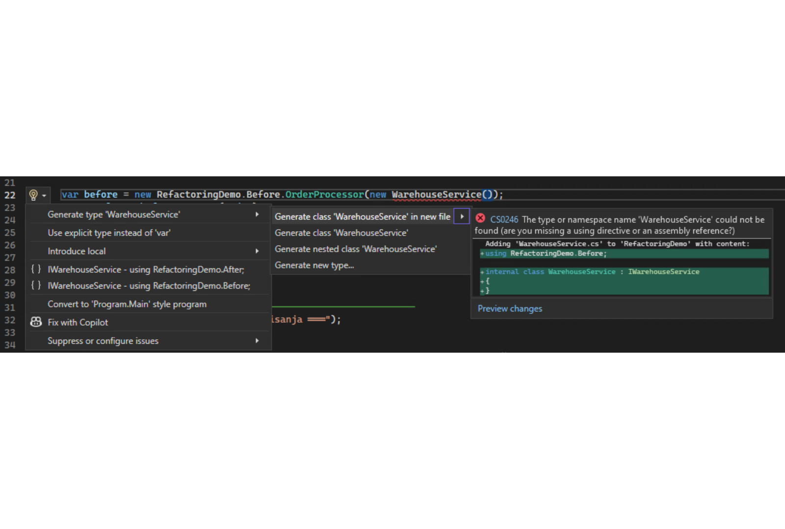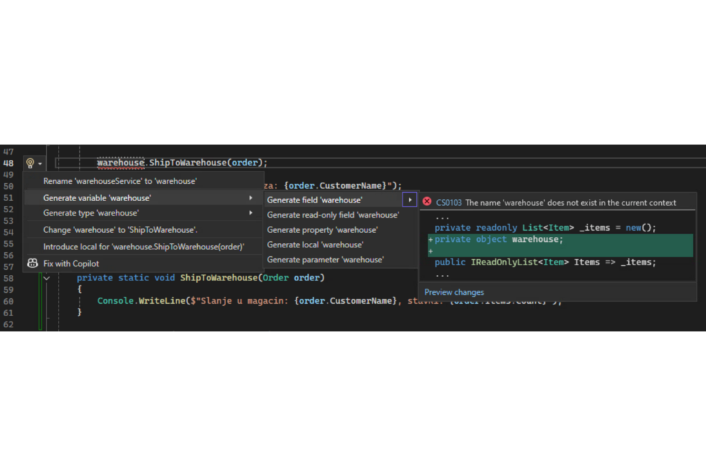 Potom se oslonimo na kompajler i automatske akcije koje nudi Visual Studio da kreiramo nove klase. Pretvaramo se da postoji sve što nam je potrebno, a on će za nas popuniti praznine: