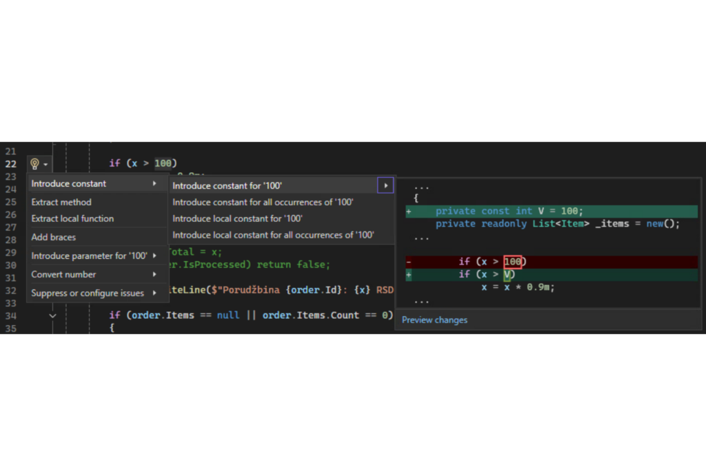 Srećom, moderna okruženja za razvoj softvera (IDE) nam nude alate za automatski refactoring, što umnogome olakšava posao i smanjuje rizik. Evo primera kako te alate možemo iskoristiti u Visual Studio okruženju: