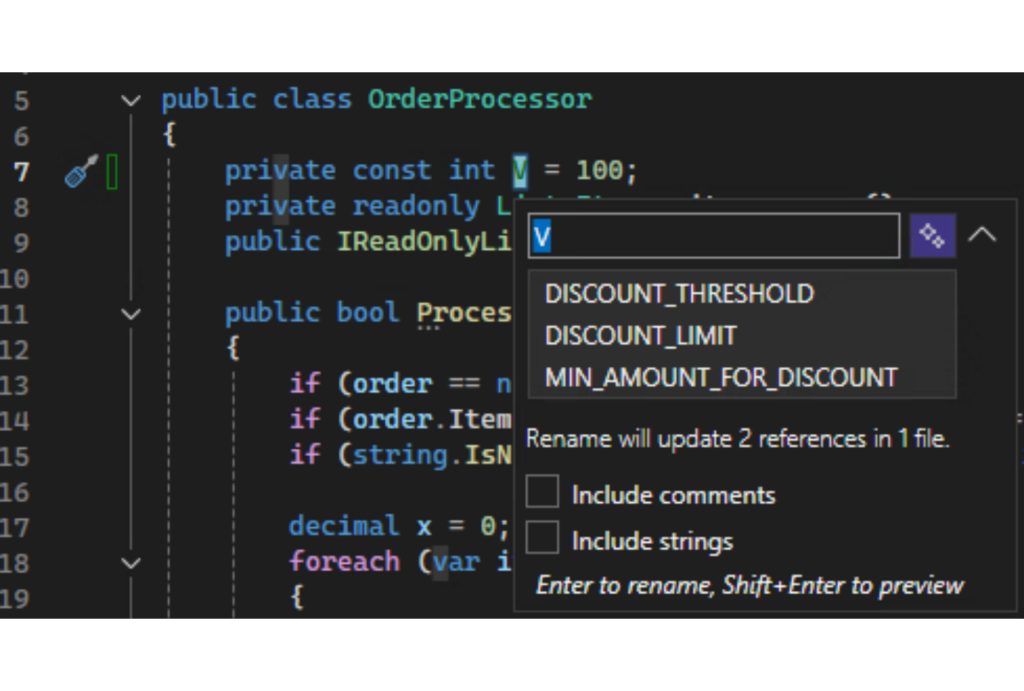 Dobar naziv je dokumentacija koja se nikad ne zastareva. Za razliku od komentara koji vremenom postaju netačni, ime metode ili promenljive je uvek ažurno — jer je deo koda koji kompajler proverava. Pet minuta preimenovanja koje ćeš danas uraditi uštedećeš nekom kolegi (ili sebi za šest meseci) sat vremena zbunjenog čitanja koda. A sa modernim IDE alatima, Rename refactoring je siguran — menja sve reference odjednom, bez rizika da nešto propustiš. Ovo, naravno, ne važi za public API, kod koga treba biti posebno oprezan jer obično ne znamo gde se sve koristi.