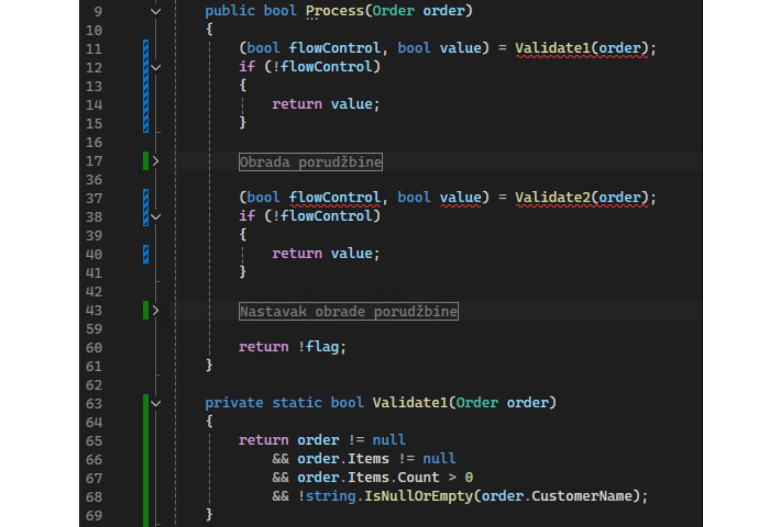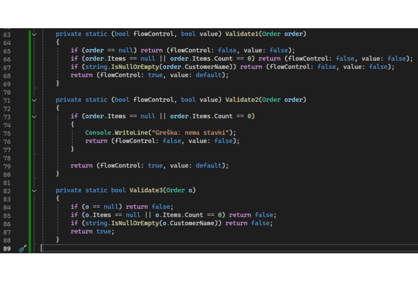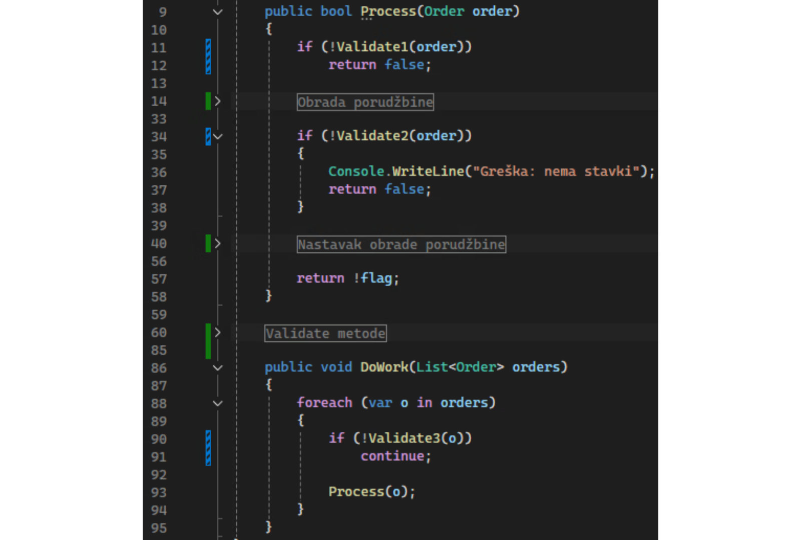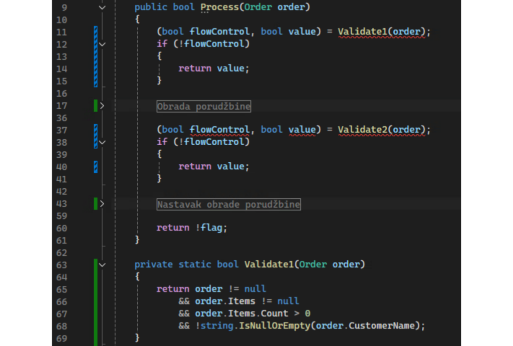 U našem primeru, validacija porudžbine se pojavljuje na tri različita mesta — u Process(), ponovo u sredini istog metoda, i treći put u DoWork():