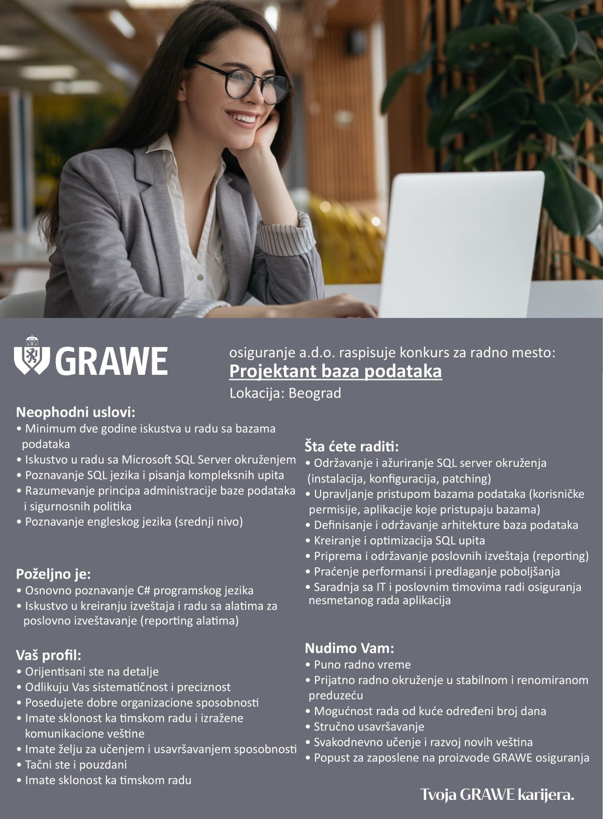 GRAWE osiguranje a.d.o. Beograd ističe se kao tradicionalna kompanija koja istovremeno može da se izdvoji kao dobar primer za napredno korporativno upravljanje i savremeni način poslovanja. Napredak Društva je rezultat stručnosti i precizno planiranih poslovnih aktivnosti u skladu sa perspektivom dugoročnog poslovanja. Dobro postavljena organizacija, kvalitetni razvojni planovi i dobra strategija poslovanja garantuju napredak i efikasnost!